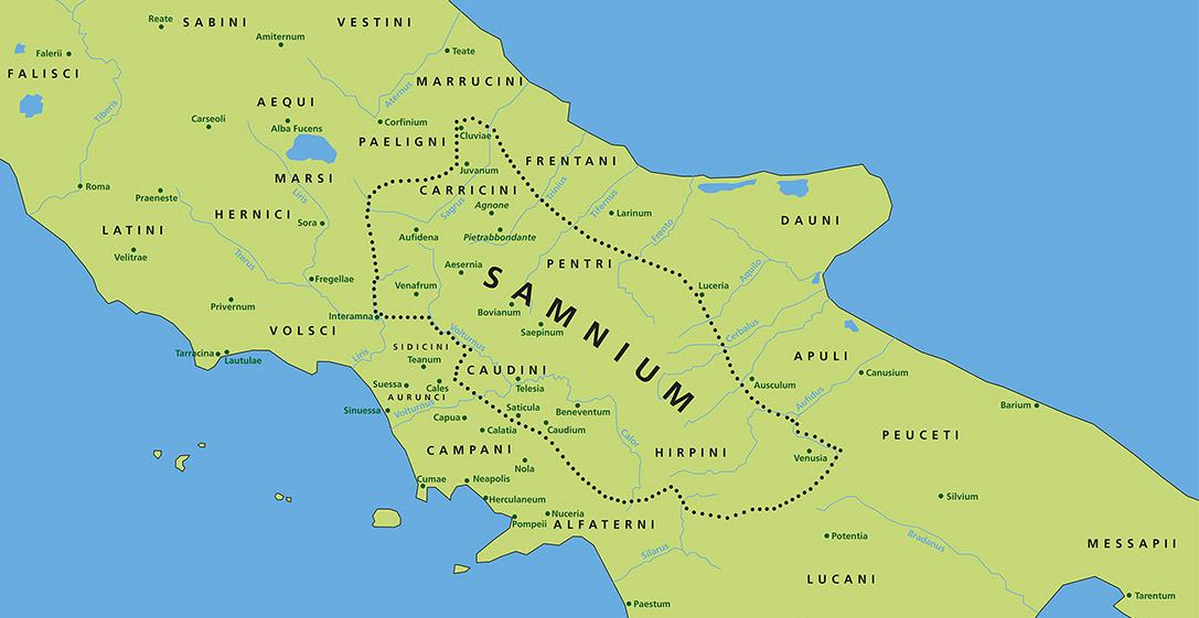 Ins Rampenlicht der Geschichte traten die Samniten durch ihre kriegerischen Konflikte mit den Römern in der zweiten Hälfte des 4. Jahrhunderts und im frühen 3. Jahrhundert v. Chr.: Die sogenannten Samnitenkriege brachten den Samniten nicht nur glänzende Siege ein wie in der berühmten Schlacht an den Caudinischen Pässen, nach der sie die römischen Legionen samt den kommandierenden Konsuln unter das Joch zwangen. Vielmehr erlitten sie auch schmerzliche Niederlagen, so dass diese Auseinandersetzung schließlich mit dem Triumph Roms endete.